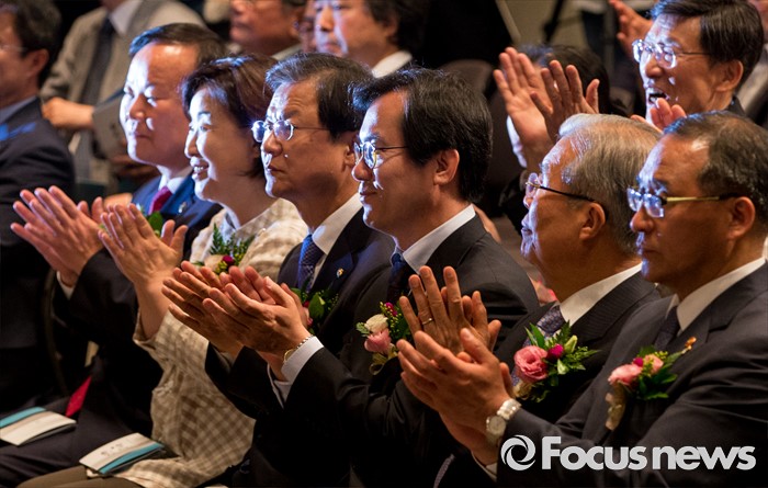 (서울=포커스뉴스) 10일 오전 서울 중구 프레스센터에서 열린 6.10 민주항쟁 제29주년 기념식에 참석한 김재원(왼쪽부터) 대통령실 정무수석, 심상정 정의당 대표, 천정배 국민의당 공동대표, 김영우 새누리당 비대위원, 김종인 더불어민주당 비대위 대표, 홍윤식 행정자치부 장관이 박수치고 있다.