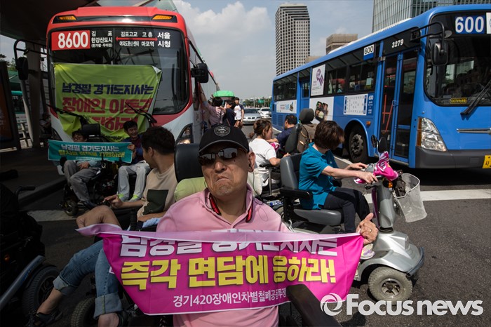 (서울=포커스뉴스) 8일 오후 서울 영등포구 여의도 환승센터 앞에서 경기장애인차별철폐공동투쟁단원들이 장애인 이동권 보장을 촉구하며 경기도행 버스를 막아서고 구호를 외치고 있다.
