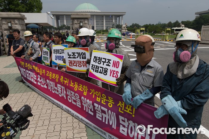(서울=포커스뉴스) 8일 오전 서울 여의도 국회 앞에서 민주노총 금속노조 조합원들와 조선소 하청업체 직원들이 구조조정 중단과 고용안전 대책을 요구하는 기자회견을 하고 있다.