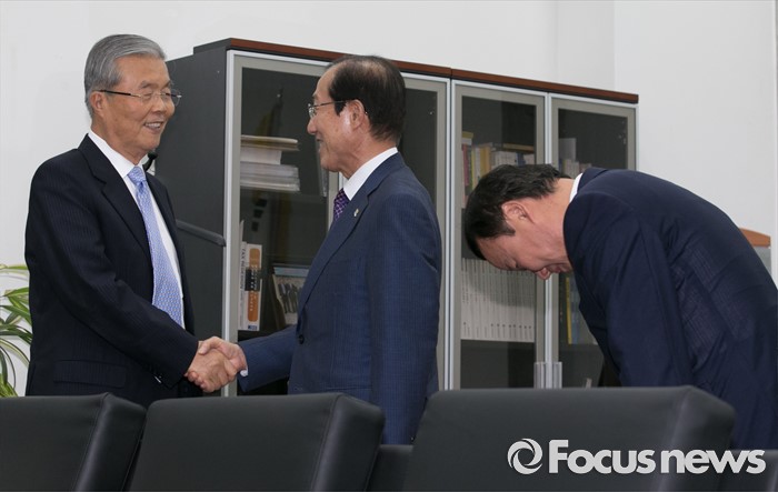 김종인(왼쪽) 더불어민주당 비대위 대표가 10일 오후 서울 여의도 국회를 방문한 이원종(가운데) 대통령비서실장, 김재원 청와대 정무수석과 면담에 앞서 인사하고 있다.