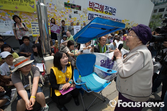 (서울=포커스뉴스) 8일 오후 서울 종로구 옛 일본대사관 앞에서 열린 제 1234차 일본군 위안부 문제해결을 위한 정기 수요시위에서 길원옥 할머니가 참가자들에게 감사 인사를 하고 있다.
