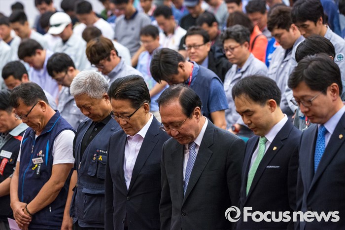 (서울=포커스뉴스) 박지원(오른쪽 네 번째) 국민의당원내대표와 노회찬(오른쪽 세 번째) 정의당 원내대표를 비롯한 한국노총 관계자 및 조선산업 노동자들이 9일 오전 서울 여의도 국회도서관 강당에서 열린 '위기의 조선산업 및 노동자 구조조정 해법 모색 대토론회'에 참석해 묵념 하고 있다.