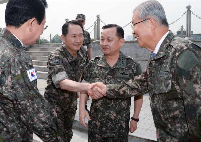 (서울=포커스뉴스) 김종인(오른쪽 첫번째) 더불어민주당 비대위 대표가 8일 오전 서울 용산구 합동참모본부를 방문해 이순진(오른쪽 두번째) 합참의장, 엄현성(왼쪽 두번째) 합참 차장과 인사하고 있다. <사진제공=더불어민주당>