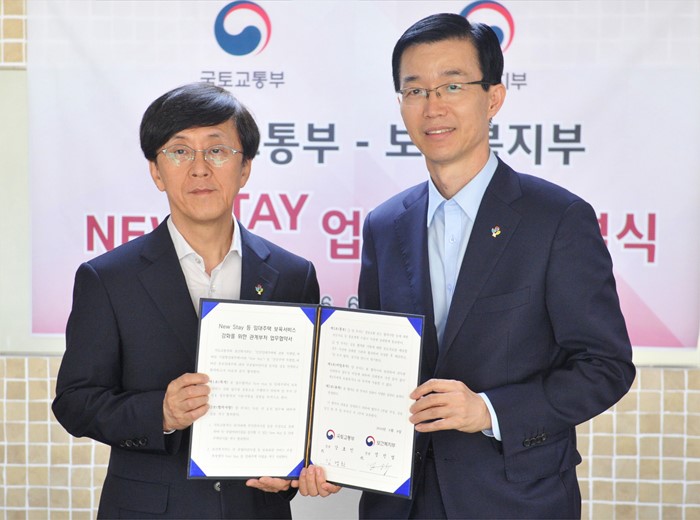 (서울=포커스뉴스) 김경환(왼쪽) 국토교통부 차관과 방문규 보건복지부 차관이 8일서울 대한주택보증공사에서 뉴스테이 단지내 국공립어린이집 유치 추진 협약을 체결하고 있다. <사진제공=국토교통부>