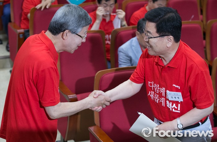 (과천=포커스뉴스) 10일 오전 경기도 과천 국가공무원인재개발원에서 열린 2016 새누리당 정책워크숍에 참석한 김희옥(왼쪽) 혁신비대위원장과 김광림 정책위의장이 인사하고 있다.