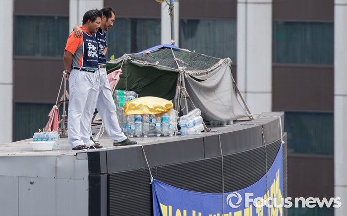 (서울=포커스뉴스) 8일 오후 서울 을지로 옛 국가인권위원회 옥상 광고탑에서 기아자동차 비정규직 노동자의 정규직화를 요구하며 363일 동안 고공농성을 벌인 한규협(왼쪽)씨와 최정명씨가 지상을 바라보고 있다.