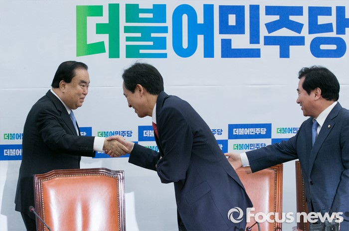 (서울=포커스뉴스) 우상호(가운데) 더불어민주당 원내대표가 8일 오후 서울 여의도 국회에서 새누리당의 국회의장직을 야당이 맡고 운영 및 법사위를 여당이 맡자는 제안과 관련 논의를 위한 4선 이상 중진 의원과의 간담회에 참석해 문희상(왼쪽) 의원과 인사하고 있다. 오른쪽은 이석현 의원.