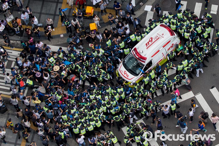 (서울=포커스뉴스) 8일 오후 서울 을지로 옛 국가인권위원회 옥상 광고탑에서 기아자동차 비정규직 노동자의 정규직화를 요구하며 363일 동안 고공농성을 벌인 한규협씨와 최정명씨가 경찰에 의해 구급차로 끌려가자 노조원들이 차량을 막아서고 있다.