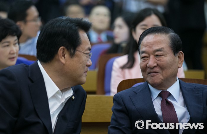(서울=포커스뉴스) 8일 오전 서울 여의도 국회 의원회관에서 열린 국가미래전략포럼(일명 알파포럼) 창립총회 및 강연회에 참석한 정진석(왼쪽) 새누리당 원내대표와 서청원 전 최고위원이 대화하고 있다. 이날 정 원내대표와 서 전 최고위원은 국회의장직을 야당에 양보한다는 뜻을 밝혔다.