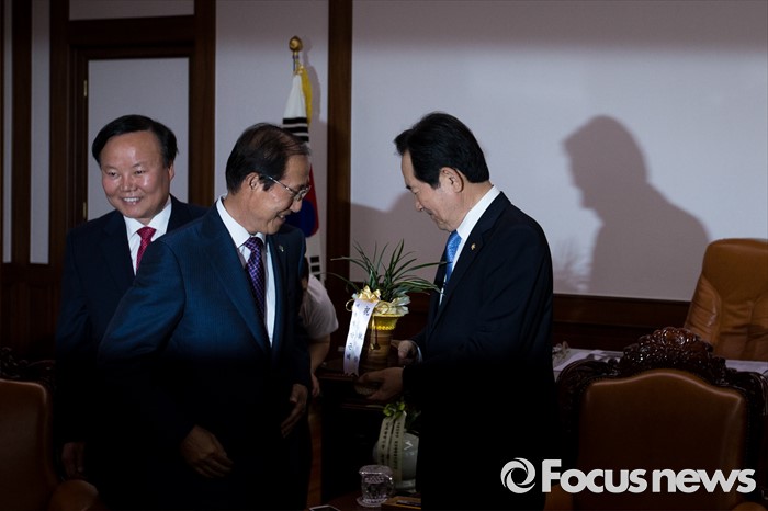 (서울=포커스뉴스) 이원종(가운데) 대통령비서실장과 김재원(왼쪽) 청와대 정무수석이 10일 오전 서울 여의도 국회에서 정세균 국회의장을 예방해 박근혜 대통령의 축하 난을 전달 하고 있다.