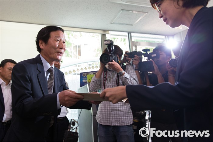 (서울=포커스뉴스) 8일 오전 서울 종로구 정부서울청사 앞에서 정기섭(왼쪽) 개성공단기업 비상대책위원회 위원장이 통일부에 방북 신청서를 제출하고 있다.