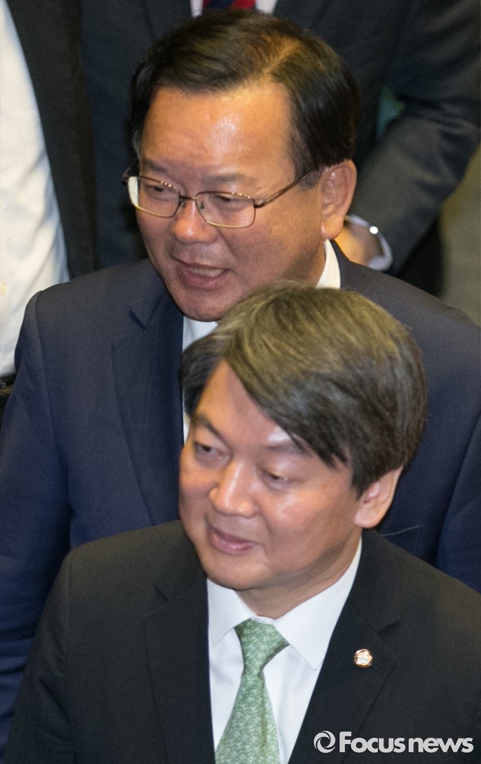 (서울=포커스뉴스) 9일 오후 서울 여의도 국회에서 열린 20대 국회 첫 본회의에 참석한 김부겸(오른쪽) 더불어민주당 의원과 안철수 국민의당 상임공동대표가 국회 부의장 선출 투표를 기다리고 있다.