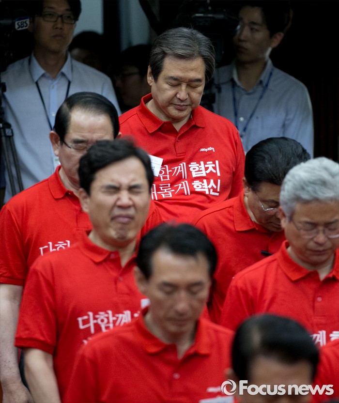 (과천=포커스뉴스) 10일 오전 경기도 과천 국가공무원인재개발원에서 열린 2016 새누리당 정책워크숍에 참석한 김무성 전 대표가 묵념을 하고 있다.