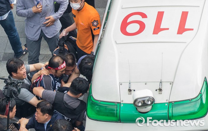 (서울=포커스뉴스) 8일 오후 서울 을지로 옛 국가인권위원회 옥상 광고탑에서 기아자동차 비정규직 노동자의 정규직화를 요구하며 363일 동안 고공농성을 벌인 최정명씨가 경찰에 의해 구급차로 끌려가고 있다.
