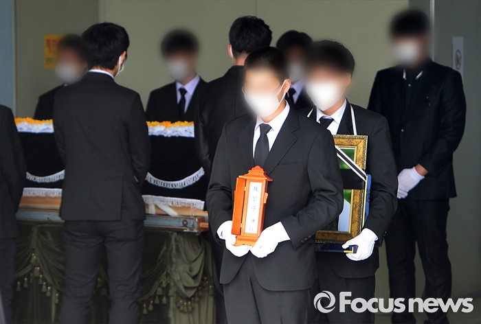 (서울=포커스뉴스) 서울 지하철 2호선 구의역에서 스크린도어를 정비하다가 숨진 김 모 군의 발인일인 9일 오전 서울 광진구 건국대학교병원 장례식장에서 고인의 영정과 관이 운구차량으로 향하고 있다.