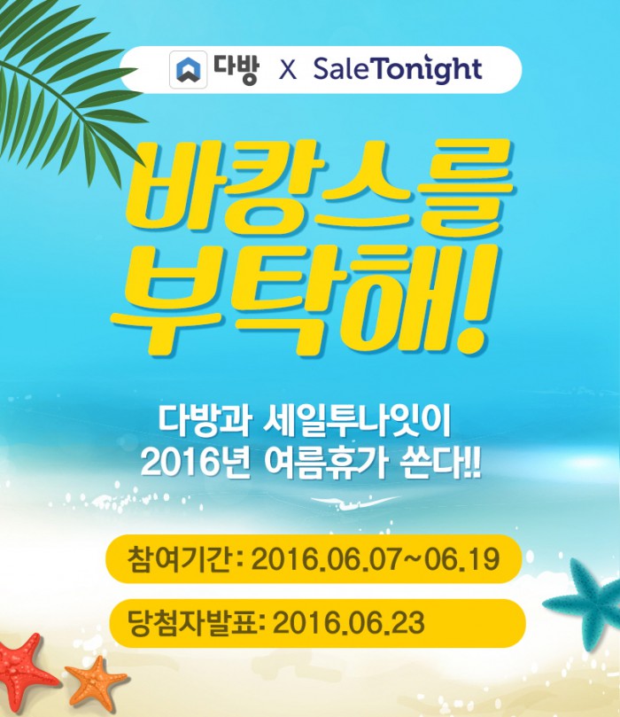(서울=포커스뉴스) 종합 타임커머스 '세일투나잇'은 부동산 O2O(온라인과 오프라인의 연계) 플랫폼 '다방'과 오는 20일까지 '여름 휴가비 지원' 이벤트를 실시한다고 9일 밝혔다.