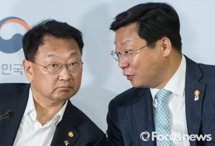 (서울=포커스뉴스) 8일 오전 서울 종로구 정부서울청사에서 유일호(왼쪽) 부총리 겸 기획재정부 장관과 주형환 산업통상자원부 장관이 구조조정 추진현황 및 계획에 대해 발표 도중 대화하고 있다.