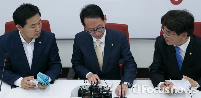 (서울=포커스뉴스) 여야 3당이 20대 국회 원구성에 합의한 8일 오후 서울 여의도 국회 새누리당 원내대표실에서 김도읍(가운데) 새누리당 원내수석부대표, 박완주(오른쪽) 더불어민주당 원내수석부대표, 김관영 국민의당 원내수석부대표가 3당 원내지도부 회동 결과를 발표한 뒤 대화하고 있다.