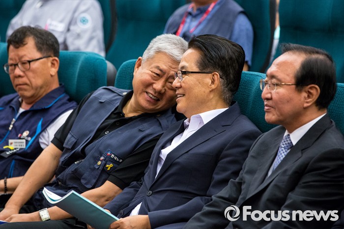 (서울=포커스뉴스) 박지원(오른쪽 두 번째) 국민의당원내대표와 김동만(왼쪽 두 번째) 한국노총 위원장이 9일 오전 서울 여의도 국회도서관 강당에서 열린 '위기의 조선산업 및 노동자 구조조정 해법 모색 대토론회'에 참석해 대화 하고 있다.