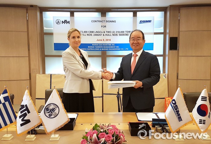 (서울=포커스뉴스) 그리스 포시도니아 박람회를 찾은 대우조선해양이 지난 8일(현지시간) 그리스 안젤리쿠시스 그룹 산하 마란가스(Maran Gas Maritime)와 마란탱커스(Maran Tankers Management)로부터 LNG선 2척, 초대형원유운반선(VLCC) 2척을 각각 수주했다.