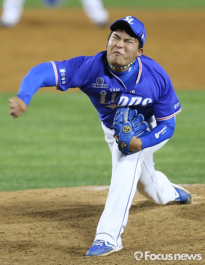 (서울=포커스뉴스) 7일 서울 잠실구장에서 열린 2016 프로야구 삼성-LG 경기에서 9회 등판한 삼성 투수 심창민이 혼신의 힘을 다해 투구하고 있다.