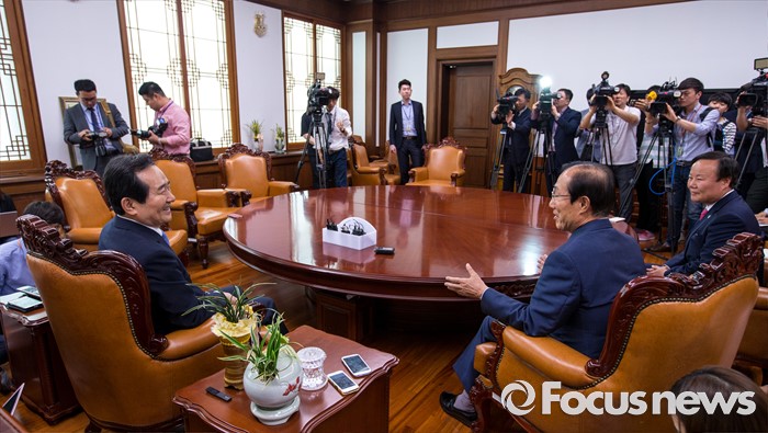 (서울=포커스뉴스) 정세균(왼쪽) 국회의장이 10일 오전 서울 여의도 국회에서 이원종(가운데) 대통령비서실장, 김재원 청와대 정무수석과 면담 하고 있다.