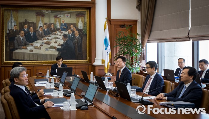 (서울=포커스뉴스) 9일 오전 서울 중구 남대문로 한국은행 본관에서 열린 금융통화위원회 본회의에 참석한 이주열 한국은행 총재 및 금통위원들이 취재진의 퇴장을 기다리고 있다.