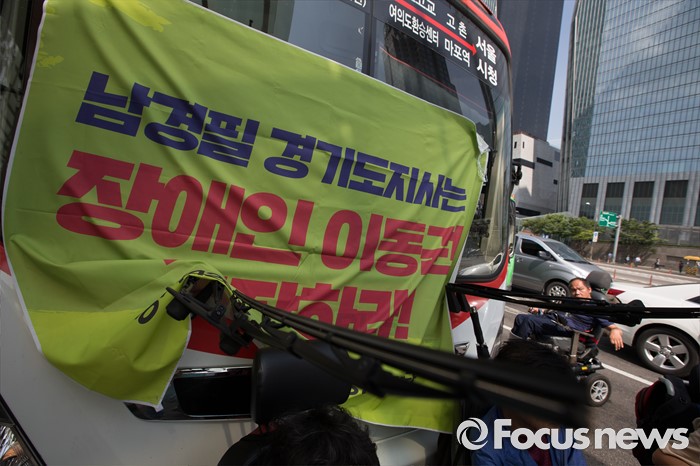 (서울=포커스뉴스) 8일 오후 서울 영등포구 여의도 환승센터 앞에서 경기장애인차별철폐공동투쟁단원들이 장애인 이동권 보장을 촉구하며 경기도행 버스를 막아서고 구호를 외치고 있다.