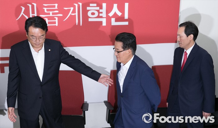 (서울=포커스뉴스) 8일 오후 서울 여의도 국회 새누리당 원내대표실에서 진행된 20대 국회 원구성 협상 등을 위한 3당 원내지도부 회동에 원내대표들이 참석하고 있다. 왼쪽부터 정진석 새누리당 원내대표, 박지원 국민의당 원내대표, 우상호 더불어민주당 원내대표.
