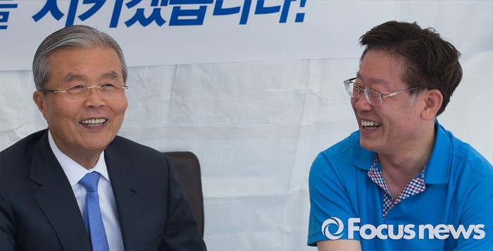 (서울=포커스뉴스) 김종인(왼쪽) 더불어민주당 비상대책위원회 대표가 8일 오후 서울 광화문광장에서 지방재정제도 개편을 반대하며 무기한 단식농성 중인 이재명 성남시장을 만나 활짝 웃고 있다.