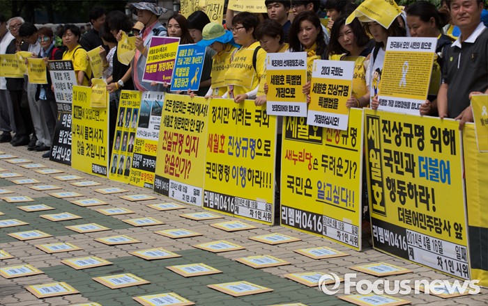 (서울=포커스뉴스) 8일 오전 서울 여의도 국회 앞에서 4.16가족협의회와 4.16연대 관계자들이 세월호 진상규명 특별법 개정 입법청원 기자회견을 하고 있다.