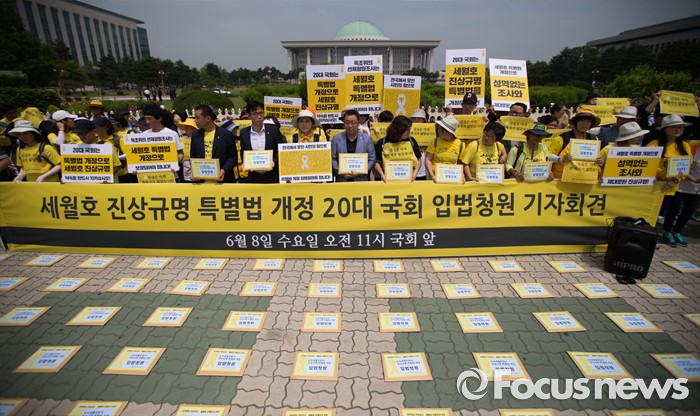 (서울=포커스뉴스) 8일 오전 서울 여의도 국회 앞에서 4.16가족협의회와 4.16연대 관계자들이 세월호 진상규명 특별법 개정 입법청원 기자회견을 하고 있다.