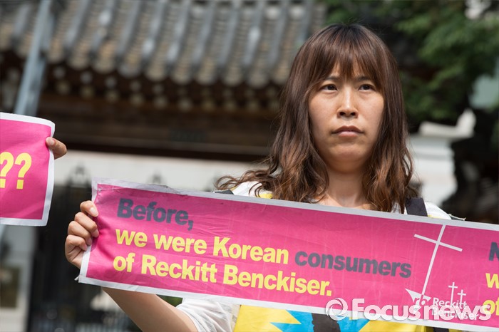 (서울=포커스뉴스) 10일 오전 서울 중구 주한영국대사관 앞에서 가습기살균제 피해 가족과 환경보건시민센터 시민 단체 관계자들이 영국대사와의 면담을 위해 들어가기 전 피켓을 들고 있다.