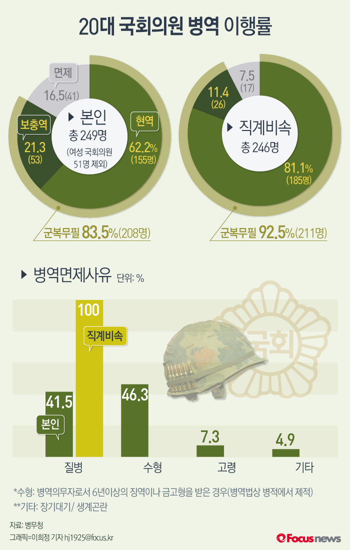 (서울=포커스뉴스) 8일 병무청이 공개한 '20대 국회의원과 직계비속 병역사항'에 따르면 제20대 국회의원 249명(여성 51명 제외) 가운데 83.5%(208명)가, 직계비속(18세 이상 남성)의 92.5%가 현역 또는 보충역 등으로 병역의무를 이행했다. 병역면제 사유로는 국회의원의 경우 수형이 46.3%, 직계비속은 질병이 100%로 가장 높았다.
