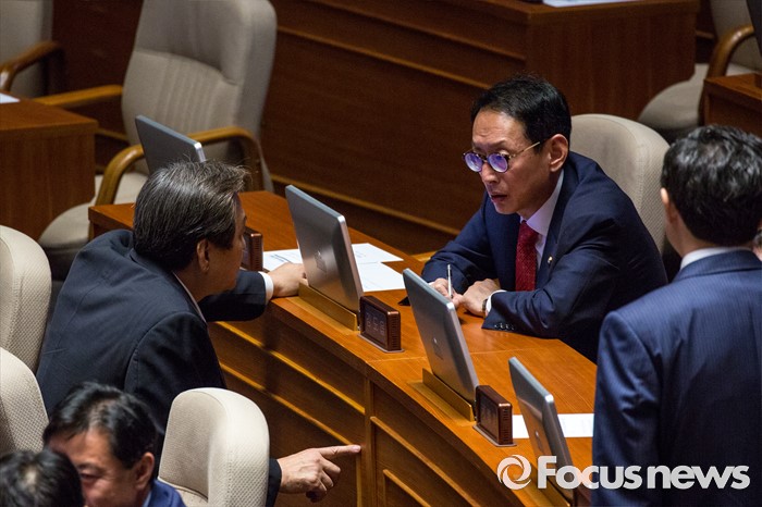 (서울=포커스뉴스) 김무성 새누리당 전 대표와 김도읍 새누리당 원내수석부대표가 9일 오후 서울 여의도 국회에서 열린 본회의에 참석해 대화를 나누고 있다.