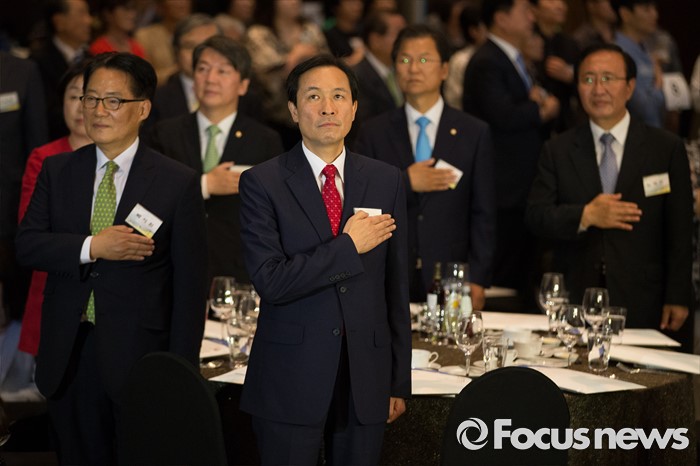 (서울=포커스뉴스) 9일 오후 서울 여의도구 63빌딩 그랜드볼룸에서 열린 '6.15 남북정상회담 16주년 기념식'에 참석한 정치인들이 국민의례를 하고 있다. 왼쪽부터 심상정 정의당 대표, 박지원 국민의당 원내대표, 안철수 국민의당 공동대표, 우상호 더불어민주당 원내대표, 천정배 국민의당 공동대표, 노회찬 정의당 원내대표.