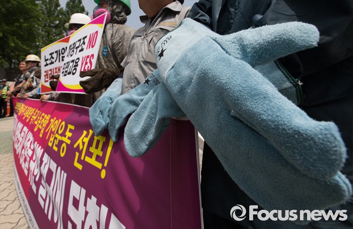 (서울=포커스뉴스) 8일 오전 서울 여의도 국회 앞에서 민주노총 금속노조 조합원들와 조선소 하청업체 직원들이 구조조정 중단과 고용안전 대책을 요구하는 기자회견을 하고 있다.
