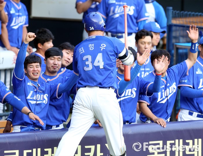 (서울=포커스뉴스) 8일 서울 잠실구장에서 열린 2016 프로야구 삼성-LG 경기 2회초 삼성 선두타자 최형우가 우월 솔로 홈런을 치고 덕아웃에서 동료들의 환영을 받고 있다.