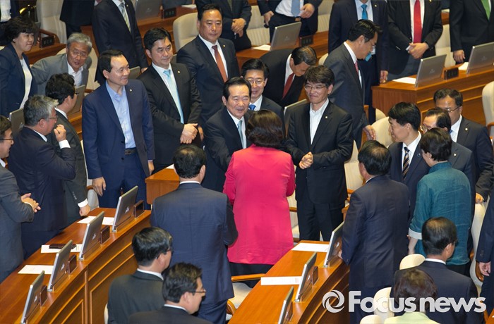 (서울=포커스뉴스) 9일 오후 서울 여의도 국회에서 열린 20대 국회 첫 본회의에서 전반기 국회의장으로 선출된 정세균 더불어민주당 의원이 단상으로 향하며 의원들의 축하를 받고 있다.