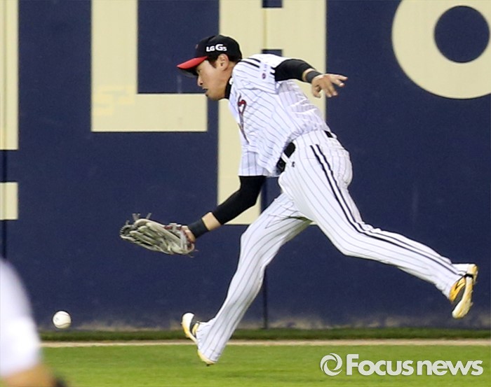 (서울=포커스뉴스) 7일 서울 잠실구장에서 열린 2016 프로야구 삼성-LG 경기 8회초 1사 1루에서 삼성 박한이의 타구가LG 중견수 임훈의 글러브에 맞고 떨어지고 있다.
