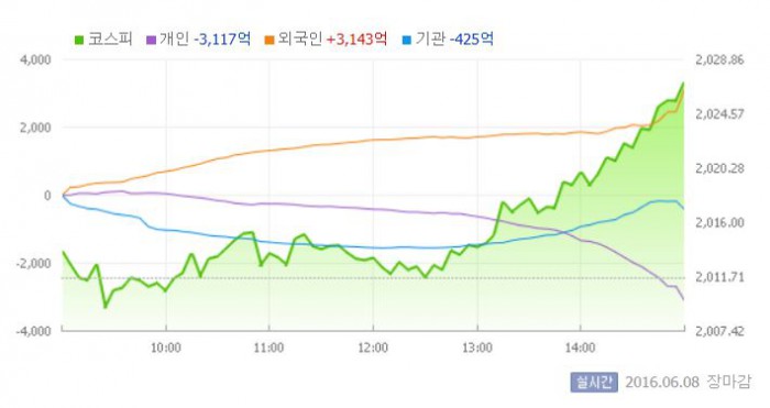 이날 코스피는 전일 대비 0.10% 상승한 2013.72로 장을 시작했다. 이후 지수는 보합권에서 등락을 반복했다. 그러나 오후 들어 외국인의 매수세가 강해지면서 상승폭을 점차 확대했다.