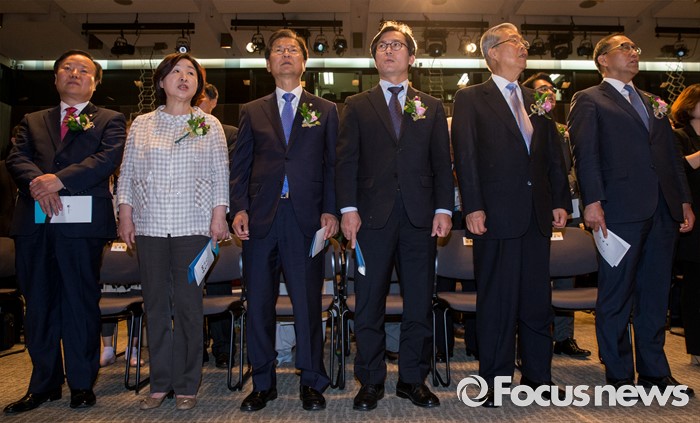 (서울=포커스뉴스) 10일 오전 서울 중구 프레스센터에서 열린 6.10 민주항쟁 제29주년 기념식에 참석한 김재원(왼쪽부터) 대통령실 정무수석, 심상정 정의당 대표, 천정배 국민의당 공동대표, 김영우 새누리당 비대위원, 김종인 더불어민주당 비대위 대표, 홍윤식 행정자치부 장관이 '광야에서'를 제창하고 있다.