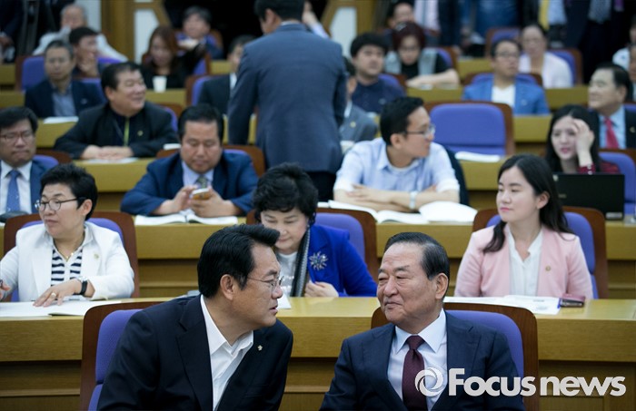 (서울=포커스뉴스) 8일 오전 서울 여의도 국회 의원회관에서 열린 국가미래전략포럼(일명 알파포럼) 창립총회 및 강연회에 참석한 정진석(왼쪽) 새누리당 원내대표와 서청원 전 최고위원이 대화하고 있다. 이날 정 원내대표와 서 전 최고위원은 국회의장직을 야당에 양보한다는 뜻을 밝혔다.