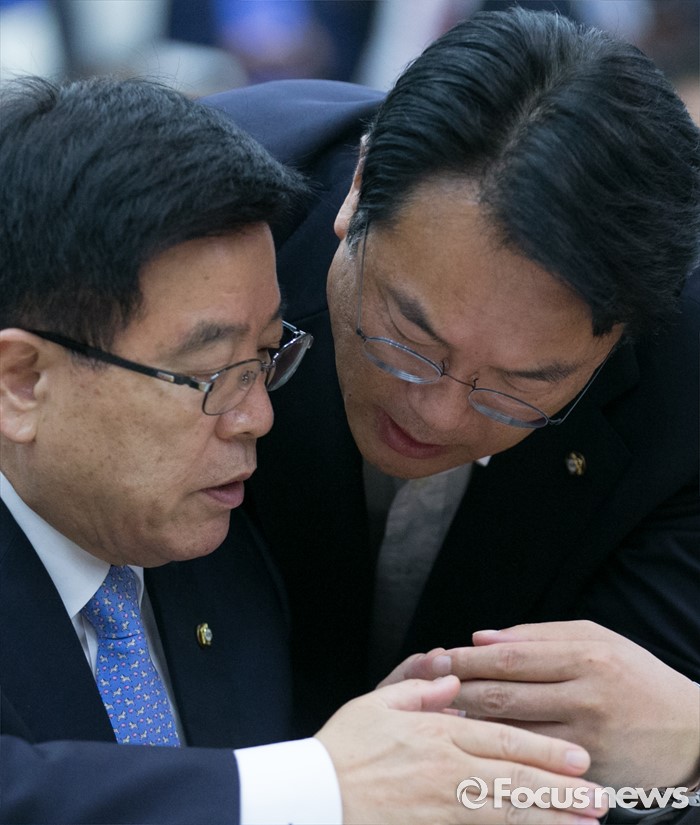 (서울=포커스뉴스) 8일 오전 서울 여의도 국회 의원회관에서 열린 국가미래전략포럼(일명 알파포럼) 창립총회 및 강연회에 참석한 정진석(오른쪽) 새누리당 원내대표와 김광림 정책위의장이 대화하고 있다. 이날 정 원내대표와 서 전 최고위원은 국회의장직을 야당에 양보한다는 뜻을 밝혔다.