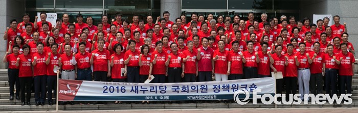 (과천=포커스뉴스) 10일 오전 경기도 과천 국가공무원인재개발원에서 열린 2016 새누리당 정책워크숍에 참석한 김희옥 혁신비대위원장, 정진석 원내대표 등 의원들이 기념촬영을 하고 있다.