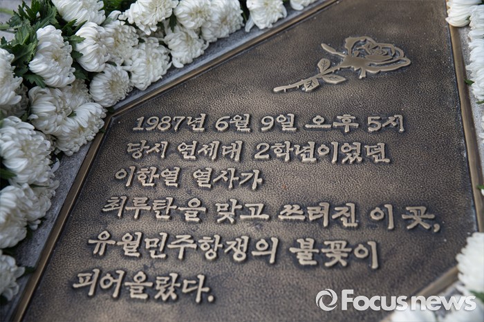 (서울=포커스뉴스) 9일 오후 서울 서대문구 연세대학교 정문 앞에서 열린 '제29주기 이한열 열사 동판 제막식에 참석한 시민들이 고인의 동판에 헌화하고 있다.