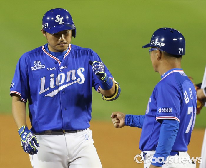 (서울=포커스뉴스) 7일 서울 잠실구장에서 열린 2016 프로야구 삼성-LG 경기 8회초 1사 3루에서 삼성 이지영이 동점을 이루는 좌전 안타를 치고 김평호 코치의 축하를 받고 있다.