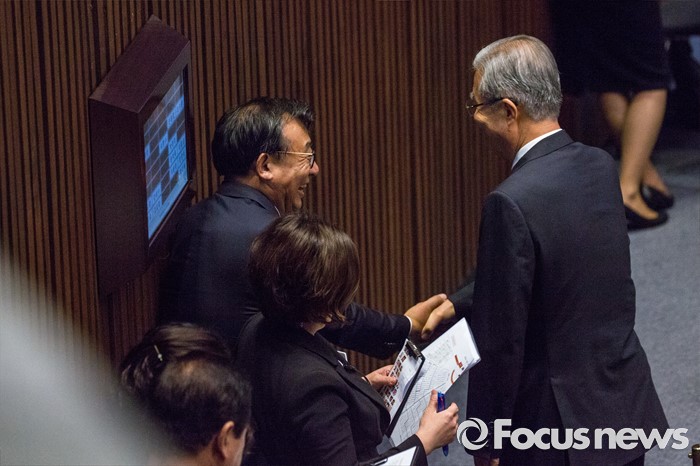 (서울=포커스뉴스) 김종인 더불어민주당 비상대책위 대표와 이정현 새누리당 의원이 9일 오후 서울 여의도 국회에서 열린 본회의에 참석해 인사 하고 있다.