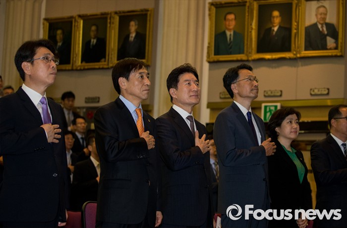 (서울=포커스뉴스) 10일 오전 서울 중구 한국은행 별관에서 열린 '한국은행 창립 66주년 기념식'에 참석한 이주열(왼쪽 두번째) 한은 총재가 국민의례를 하고 있다.