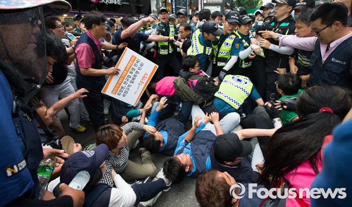 (서울=포커스뉴스) 사내하청 전원 정규직화를 요구하며 고공농성을 벌여온 기아자동차 사내하청 노동자 최정명씨와 한규협씨가 농성을 중단한 8일 오후 서울 중구 옛 국가인권위원회 건물 옥상 광고탑 농성장에서 내려와 병원으로 이동하던 중 경찰과 노조원들이 실랑이를 벌이고 있다.